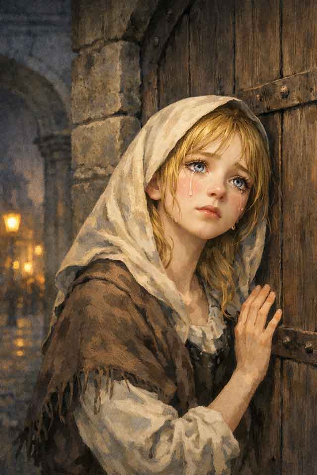 さて、今まさにそこを通り過ぎようとしたとき、閉ざされた寺の門に寄りかかり、声をこらえて泣いている 一人の少女を見つけた。年は十六、七歳ほどだろう。かぶっていた布からこぼれる髪は 淡い金色で、着ている服も 汚れているようには見えない。