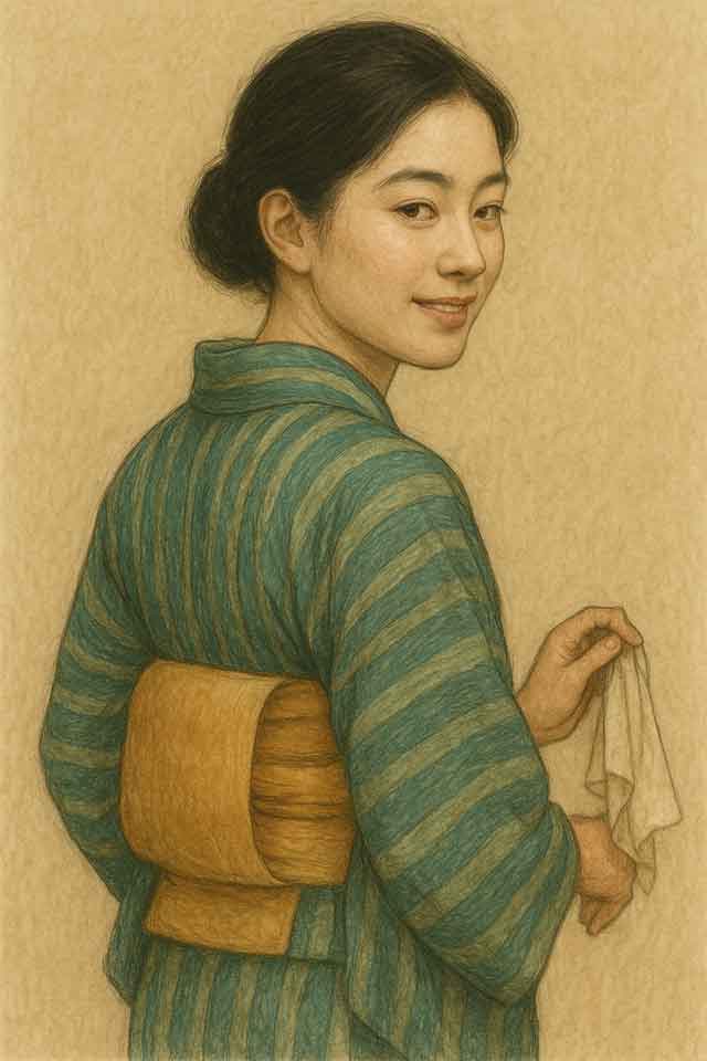 子供にみやげの玩具が鳴ったに違いない。はやがて風呂敷包みを もとのとおりに結んだとみえる。蚊帳かやの向こうで「お先へ」と言う声がした。三四郎はただ「はあ」と答えたままで、敷居にしりを乗せて、団扇うちわを使っていた。いっそこのままで夜を明かしてしまおうかとも思った。けれどもがぶんぶん来る。外ではとてもしのぎきれない。三四郎はついと立って、鞄の中から、キャラコのシャツとズボン下を出して、それを素肌すはだへ着けて、その上からこん兵児帯へこおびを締めた。それから西洋手拭タウエル二筋ふたすじ持ったまま蚊帳かやの中へはいった。は蒲団の向こうのすみでまだ団扇うちわを動かしている。