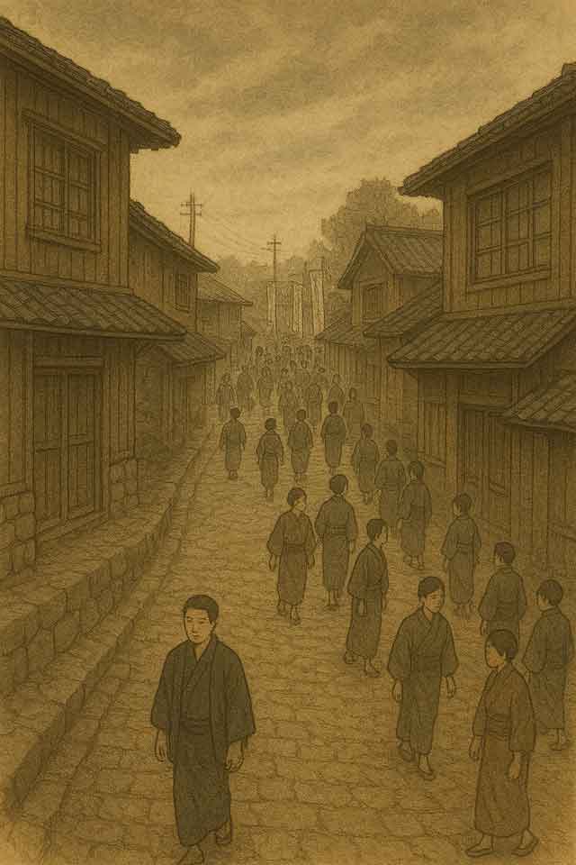 九時半に着くべき汽車が四十分ほど遅れたのだから、もう十時はまわっている。けれども暑い時分だから町はまだよいの口のようににぎやかだ。宿屋も目の前に二、三軒ある。ただ三四郎には ちと りっぱすぎるように思われた。そこで電気灯のついている三階作りの前をすまして通り越して、ぶらぶら歩いて行った。むろん不案内の土地だからどこへ出るかわからない。ただ暗い方へ行った。は なんともいわずに ついて来る。すると比較的寂しい横町のかどから二軒目に御宿おんやどという看板が見えた。これは三四郎にもにも相応なきたない看板であった。三四郎はちょっと振り返って、一口ひとくちにどうですと相談したが、は結構だというんで、思いきってずっとはいった。上がり口で二人連れではないと断るはずのところを、いらっしゃい、――どうぞお上がり――御案内――うめの四番などと のべつに しゃべられたので、やむをえず無言のまま二人とも梅の四番へ通されてしまった。