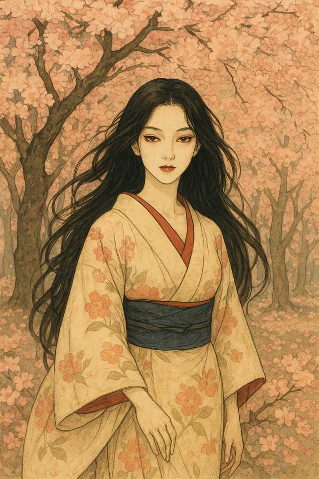 そこは桜の森の ちょうどまんなかのあたりでした。四方の涯は花にかくれて奥が見えませんでした。日頃のような怖れや不安は消えていました。花の涯から吹きよせる冷めたい風もありません。ただひっそりと、そしてひそひそと、花びらが散りつづけているばかりでした。彼は始めて桜の森の満開の下に坐っていました。いつまでもそこに坐っていることができます。彼はもう帰るところがないのですから。